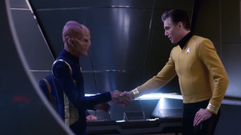 Die Lösung aller Probleme, die sich in Season 1 angehäuft haben, hat einen Namen: Christopher Pike. Anson Mount gibt den legendären ersten Captain der „Enterprise“, der nach dem Ausscheiden von Spiegel-Schurke Lorca das Kommando über die „Discovery“ übernimmt, in deutlicher Anlehnung daran, wie Jeffrey Hunter den Charakter Mitte der 60er angelegt hat. Das bedeutet: Er erinnert letztlich an den kumpelhaften Weltraum-Draufgänger James T. Kirk – die „neue“ (eigentlich ja alte) Uniform unterstreicht das noch. Dank Pikes Auftauchen wechselt „Discovery“ (die Serie) die Perspektive auf „Discovery“ (das Schiff) – etwas, das durch Michael Burnham (Sonequa Martin-Green) als Hauptfigur ja eigentlich vermieden werden sollte. Der neue Kommandant übernimmt den Platz von Interimskapitän Saru (Doug Jones) und stellt endlich, endlich jene Frage, die hoffentlich nicht nur mich seit langem bewegt: Wie heißt ihr alle überhaupt?! Die Nebenfiguren bekommen Namen und dürfen sich in der Folge sogar unterschiedlich verhalten, sodass sie zu tatsächlichen Charakteren werden.